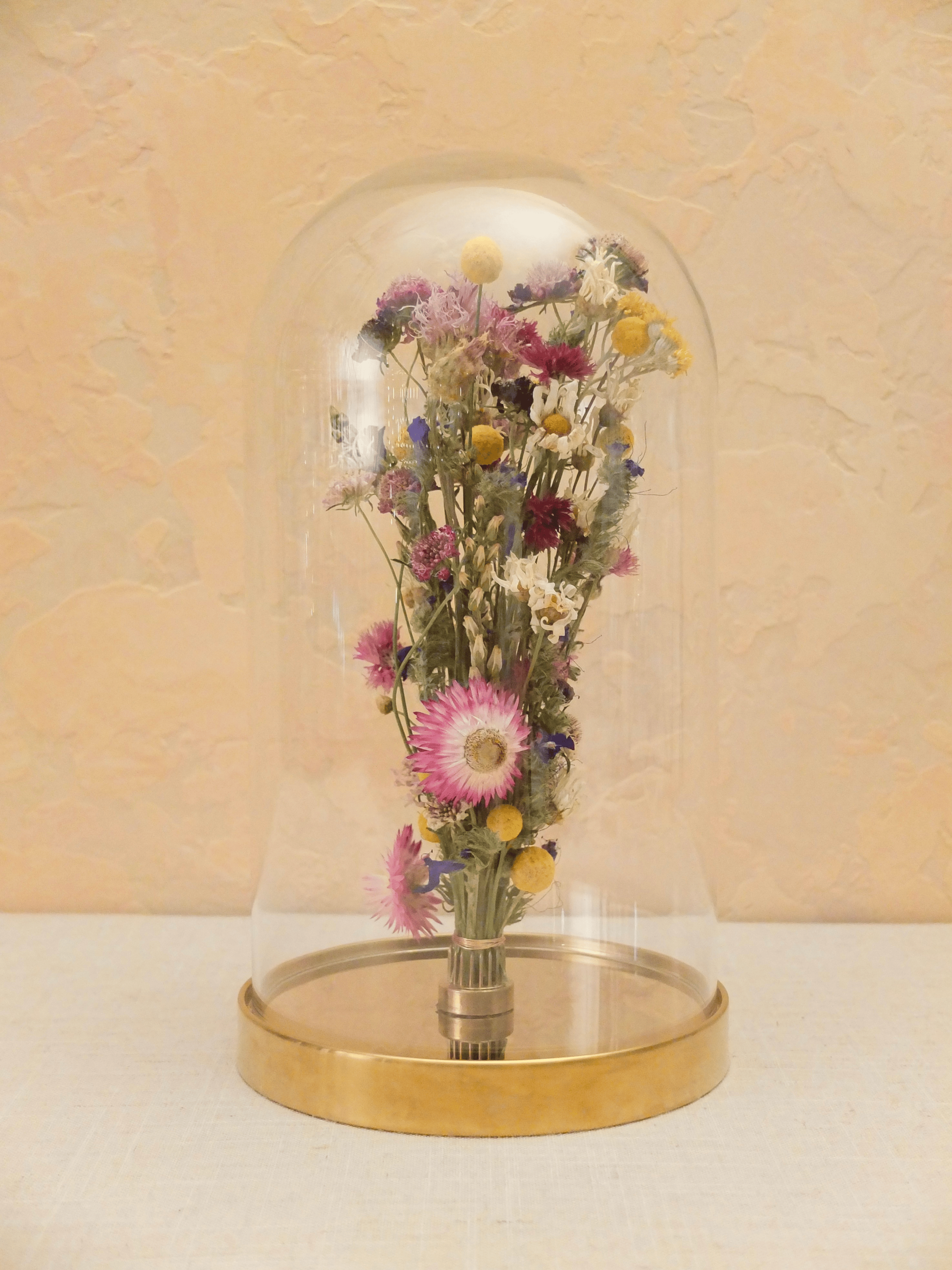 A bell jar with a beautiful bouquet of dried and preserved flowers by Fable and Twig
